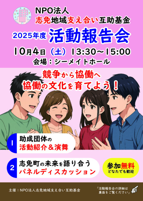 ニュース&トピックス2025.10.092025年度活動報告会 アンケートの集計結果 ポスト シェア 送る 2025年10月4日(土)の13:30より、志免町にあるシーメイトホールで開催をした『2025年度活動報告会』の際に、参加された皆さま方から頂いたアンケートの集計結果が出ましたのでこの場をお借りしまして公開いたします。 20251004_活動報告会_参加者アンケート結果ダウンロード 関連記事「志免地域支え合い互助基金の活動報告会」開催のご案内 (2025/10/4)2025.10.02