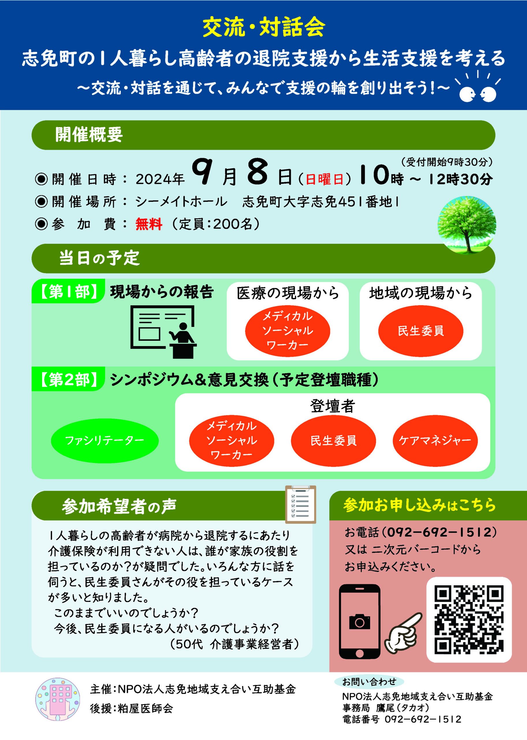 2024年に行った「退院支援から生活支援を考える」シンポジウムが開催された後、参加者の皆さんで「志免町民の生活支援を考える会」を立ち上げました。
